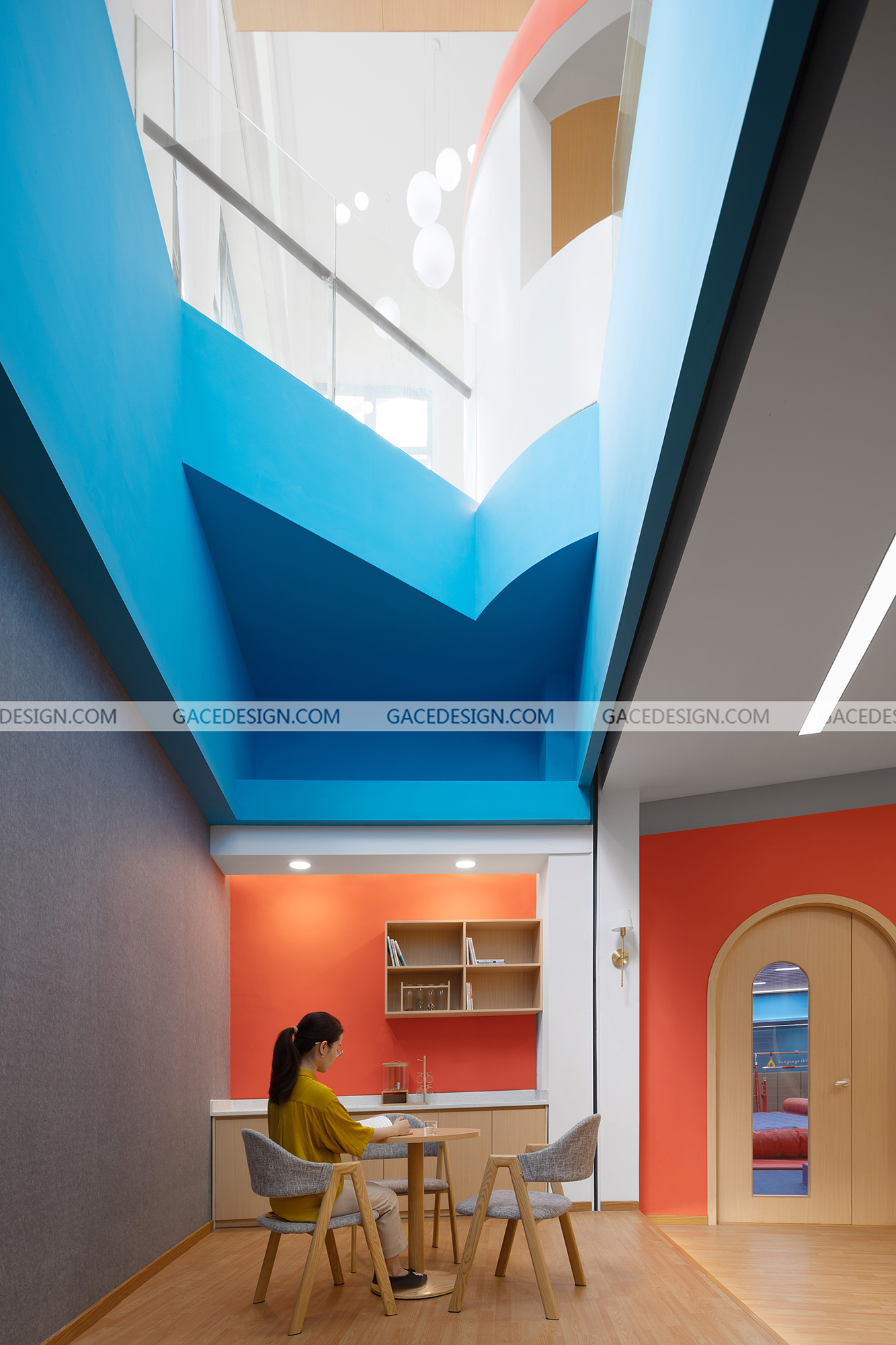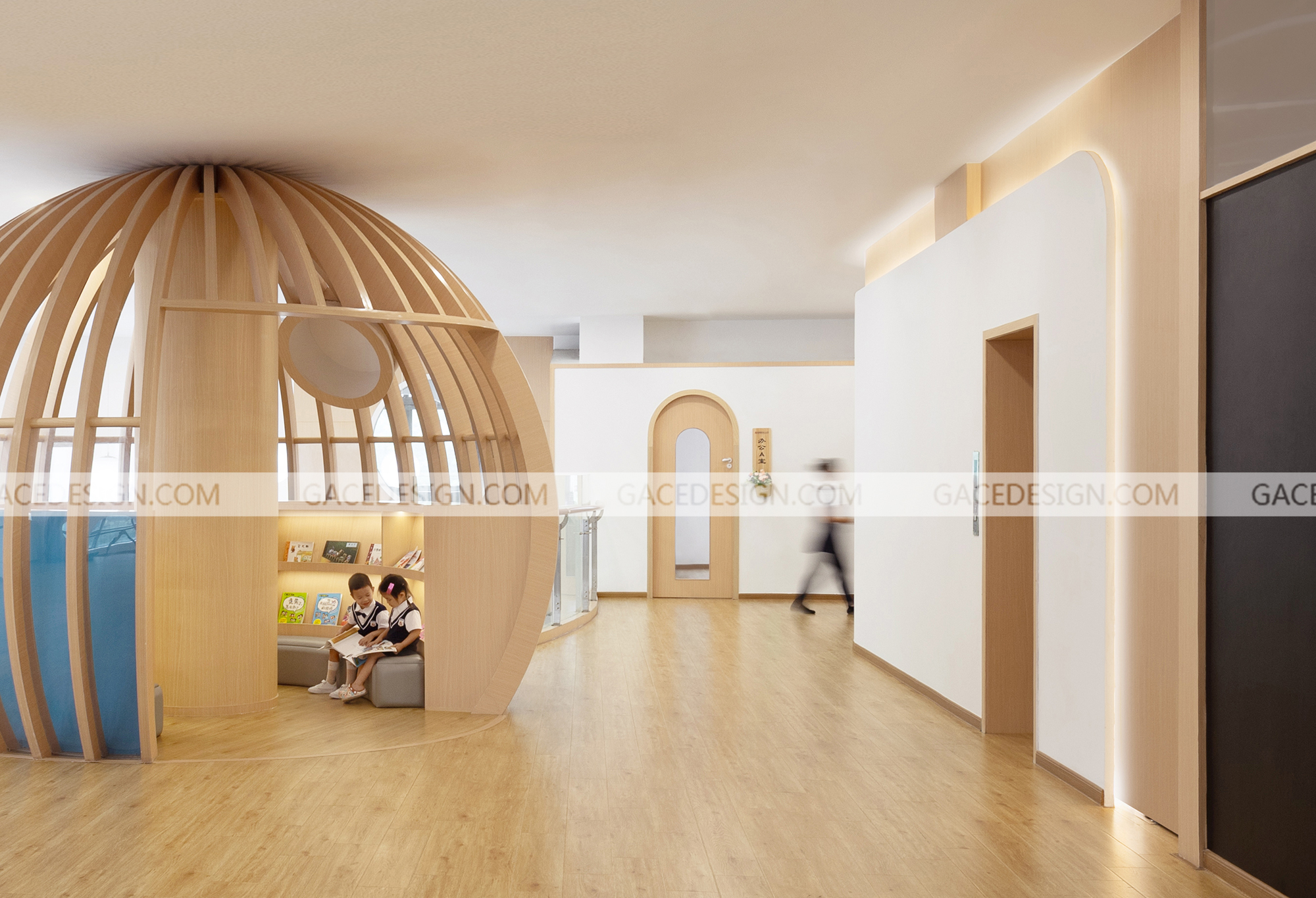 設(shè)計(jì)思考:隨著互聯(lián)網(wǎng)和人工智能的高速發(fā)展,知識(shí)的傳授方式基本上可以通過線上課程來完成。并給予孩子和家庭以更大的時(shí)間自由度來進(jìn)行選擇。那么,作為物理性的教育空間如果不往前跑,是很難順應(yīng)未來的教育變化。我們?cè)谒伎嘉磥淼慕逃臻g應(yīng)該嘗試做些怎樣的改變?這次我們大膽的向未來踏出一步。通過對(duì)未來的思考加強(qiáng)對(duì)空間的整理并呼應(yīng)「未來學(xué)園」的主題進(jìn)行了空間環(huán)境的重塑。
