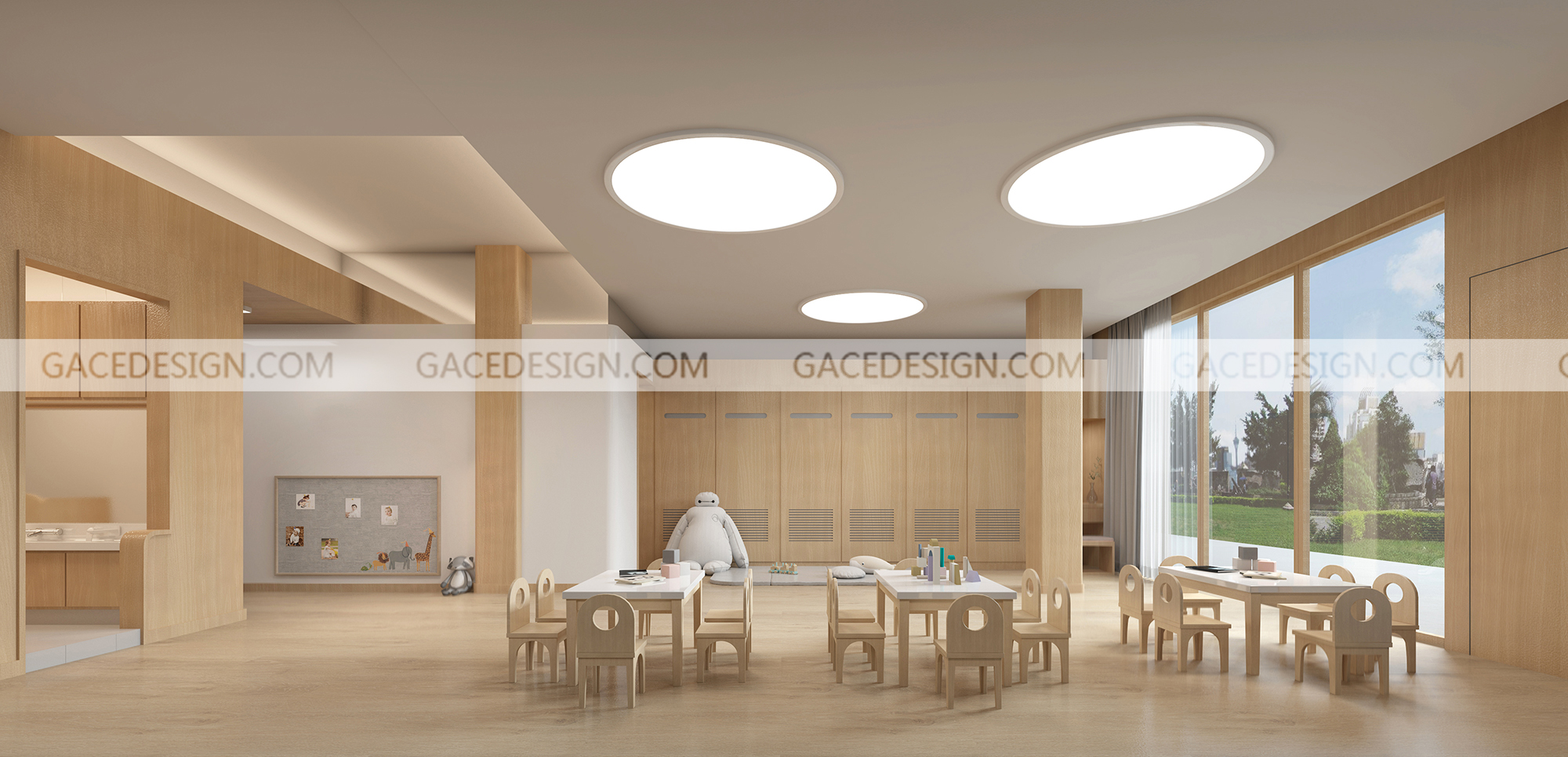 設計思考:首先擺在我們面前的是要解決通風和采光問題。作為家長對于空間的要求,除了安全以外,最在意的就是通風和采光。在室內采用了兩種視角,即成人和小孩的視野,場地一共設計了4個托育班,1個科學育兒指導區,其他均是配套功能等。讓成人亦可投入這個兒童空間,真正地塑造出能讓人安心的空間。新空間在視覺上更加開闊,前廳均有充足的自然光線,環境明亮且溫暖。從前廳過道到科學育兒指導區,是一個眼前一亮的開放性空間。純凈的室內空間讓孩子們擁有更多創造的空間。這里能提供街道和社區科學育兒指導站建設指導,為街道和社區指導站運作提供支持。所以該空間需要一定的活動面積,需要承載開展活動、爬行、感統區,游樂繪本等互動性功能。我們試圖打破這種室內外一刀切所帶來的生硬的邊界感,通過設計我們最大程度的把陽光帶給教室,讓教室形成豐富的多層次視野。配合明亮的落地窗,讓孩子的活動空間更加通透。