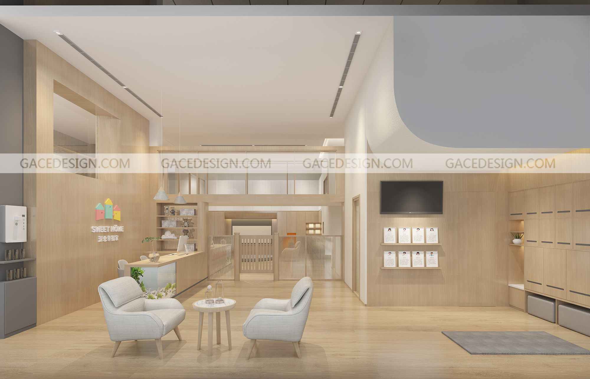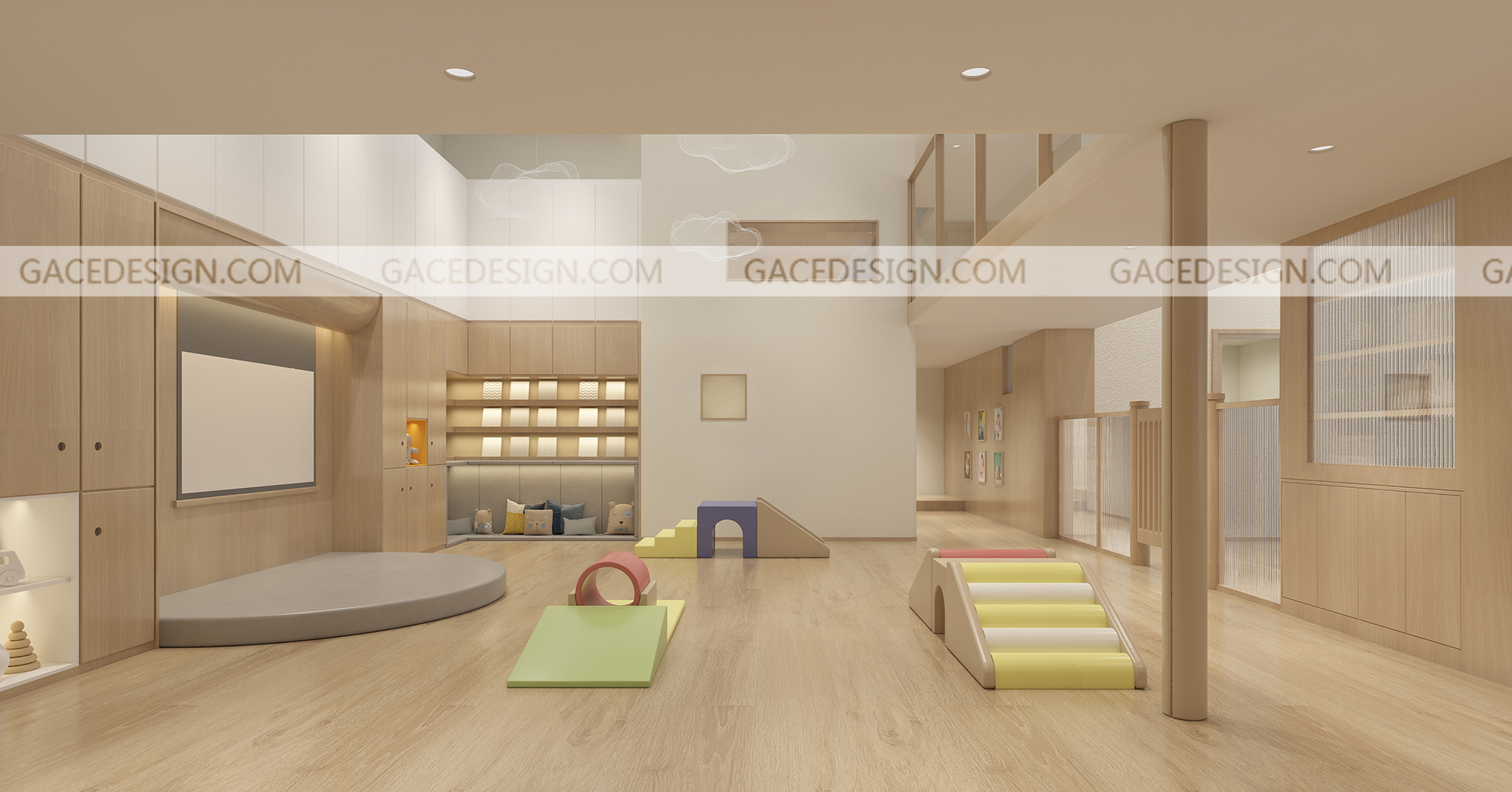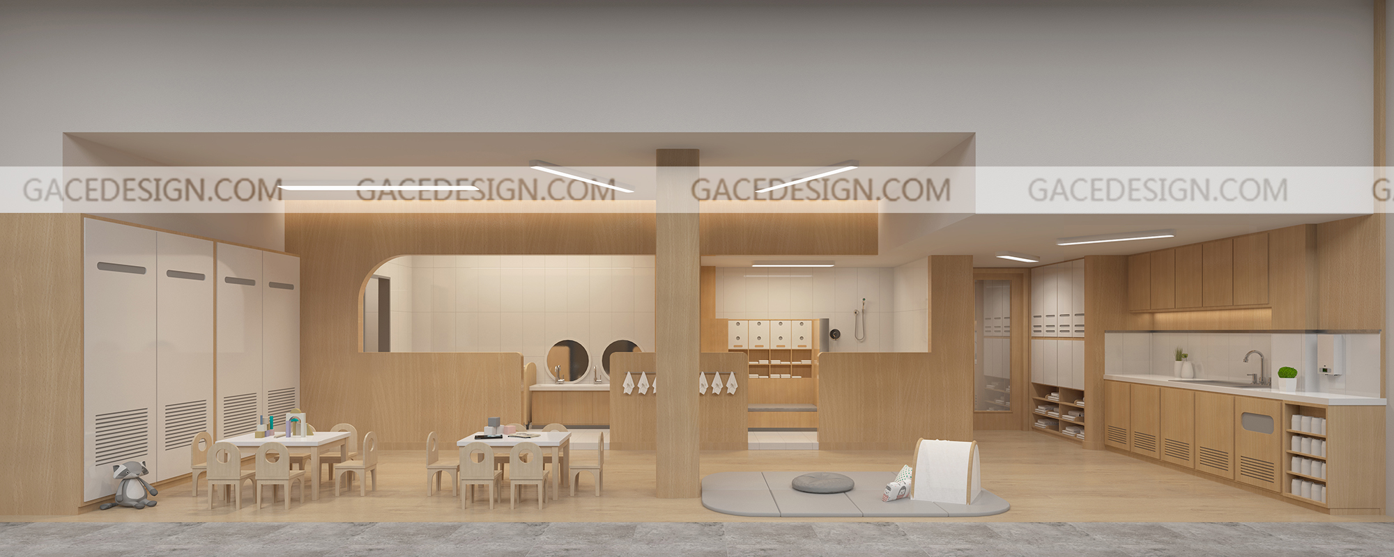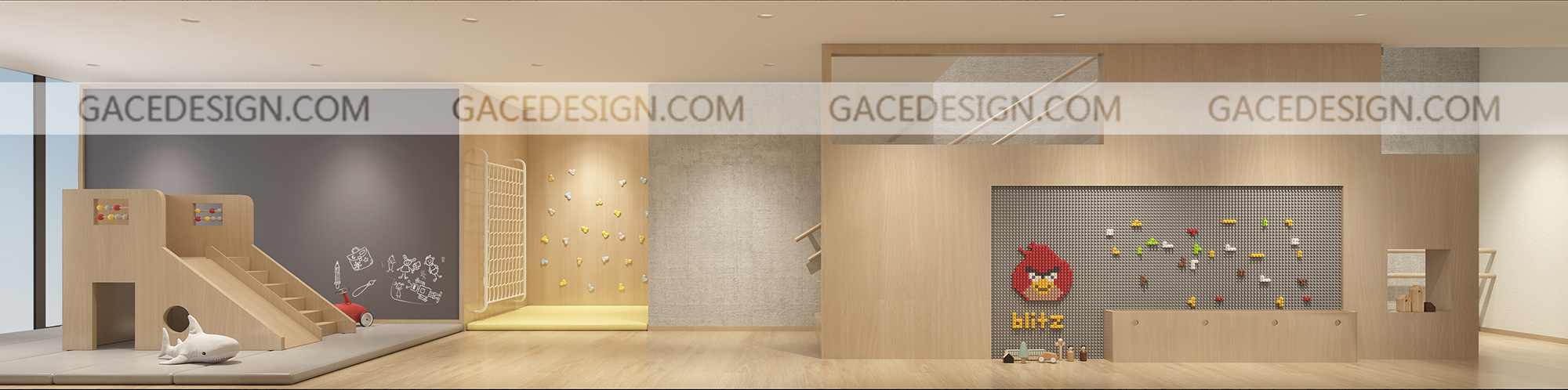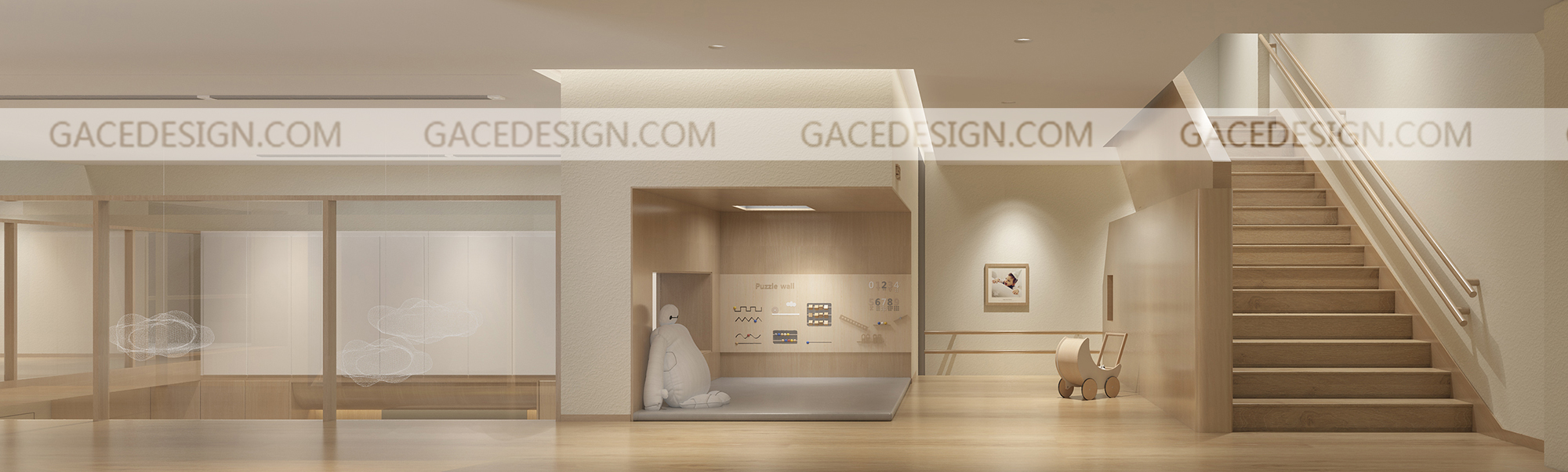 從前廳入口,我們?cè)O(shè)置了一個(gè)門廳,孩子就像回家一樣,在門廳處就完成了換鞋和洗手的功能,孩子有專屬的換鞋凳和鞋柜。空間造型上我們進(jìn)行了簡(jiǎn)化,保留了原有的層高,讓陽(yáng)光最大程度的映入空間。在前臺(tái)處我們還設(shè)置了孩子尺度可觀賞的魚缸。在空間基調(diào)上我們選擇了柔和木質(zhì)材料與自然光線的映射,使空間呈現(xiàn)明快輕松的氛圍。為了讓孩子自己與環(huán)境互動(dòng),我們?cè)谝粚釉O(shè)置了一個(gè)空曠的空間,孩子們能夠在這里安全的爬行和玩耍,我們根據(jù)不同年齡段孩子的需求還設(shè)置了不同的區(qū)角,益智區(qū)、繪本角、涂鴉墻和感統(tǒng)區(qū)等等。在樓梯閣樓中我們加入了更多可互動(dòng)性的功能。通過墻上的樂高墻壁,區(qū)域角的閱讀小書屋,攀爬區(qū),滑梯,涂鴉墻。除此之外教室設(shè)計(jì)應(yīng)充分的考慮孩子們的尺度和保育員的保育便捷和操作性。我們?cè)陧?xiàng)目中嘗試探討空間與兒童的探索關(guān)系。努力營(yíng)造一種孩子可以自己發(fā)育成長(zhǎng)的環(huán)境模式。