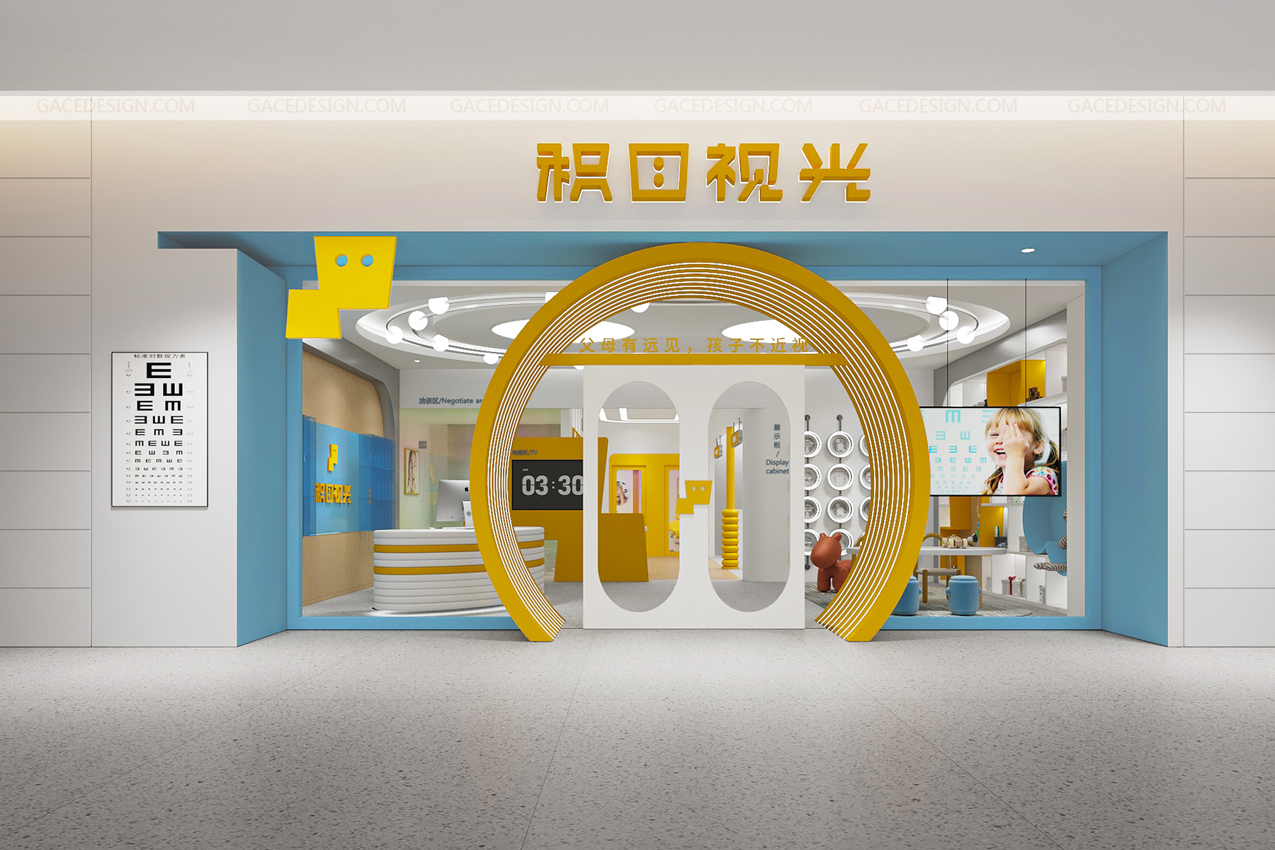 設計說明:將品牌IP最大化融入到空間。以鮮明的品牌形象色,傳達了引領行業趨勢的新理念。友好的圖形具象化,強烈的對比色在市場打出差異化。讓整個場景與兒童體驗起來更生動有趣。,所有的尺寸根據兒童的人體工學進行搭配。每一個小細節都對兒童友好。一切都是圓的,沒有可以撞到的角落。