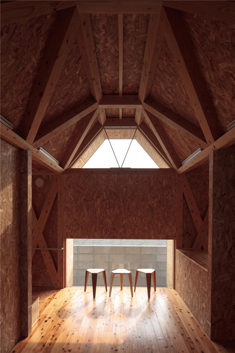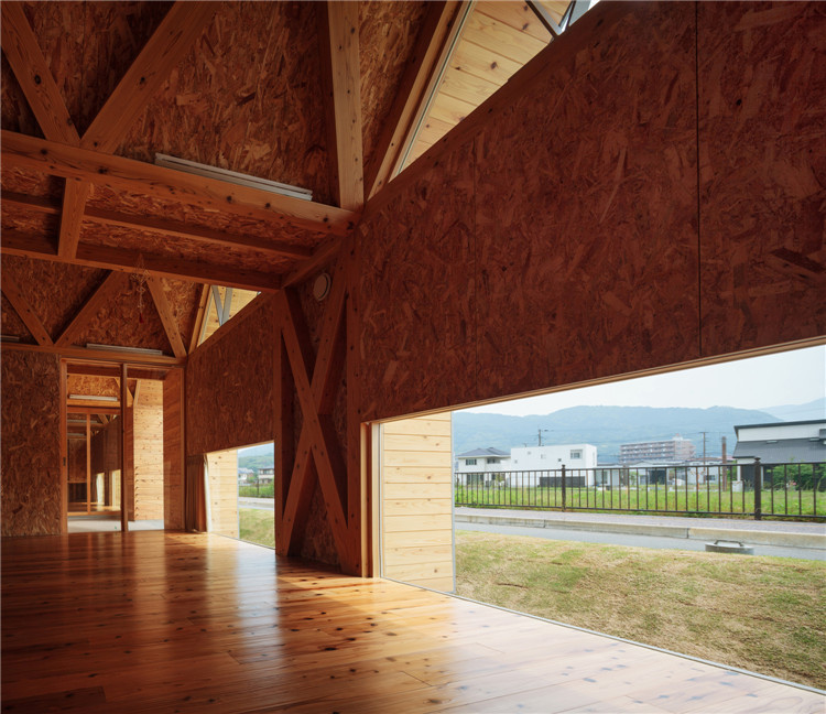 建筑的所有結構不是天花板就是墻體,木桁架梁傾斜設置,是屋頂的基礎結構木構件。這樣的設計滿足了客戶對于“保育室被木頭包圍”的要求,減少了建設成本。此外,通過降低天花板的高度,木材長度被縮短了,對空調的需求也降低了。由于天花板幾何形狀不規則且窗戶為梯形,因此雖然天花板最低的地方只有2.2m左右,但即使是成年人也不會感到壓抑。