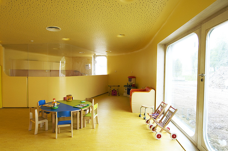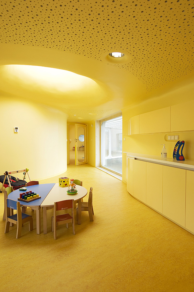 此外雨水管位于建筑側面,這樣家長們永遠不用抱起孩子跨過水溝。內部空間的組織都圍繞著高度安全的圓形中央空間,孩子們的空間圍繞并匯聚于此。每個相鄰的空間都彼此連通便于相互照料,最大程度的保證了安全。中心帷幕似的木結構最高處是3米寬的聚碳酸酯拱形天花板,保證室內全天都沐浴在充足的陽光之下。幼兒園設計