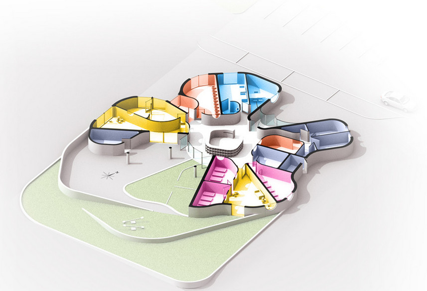 為了保證設施的安全,所以在內部配件的設計中,消除了所有的直角結構,并提供平滑彎曲的邊緣,即使連鋒利的邊緣也被倒圓。這些是該建筑的特點之一,外墻像波浪一樣進入了內部空間。