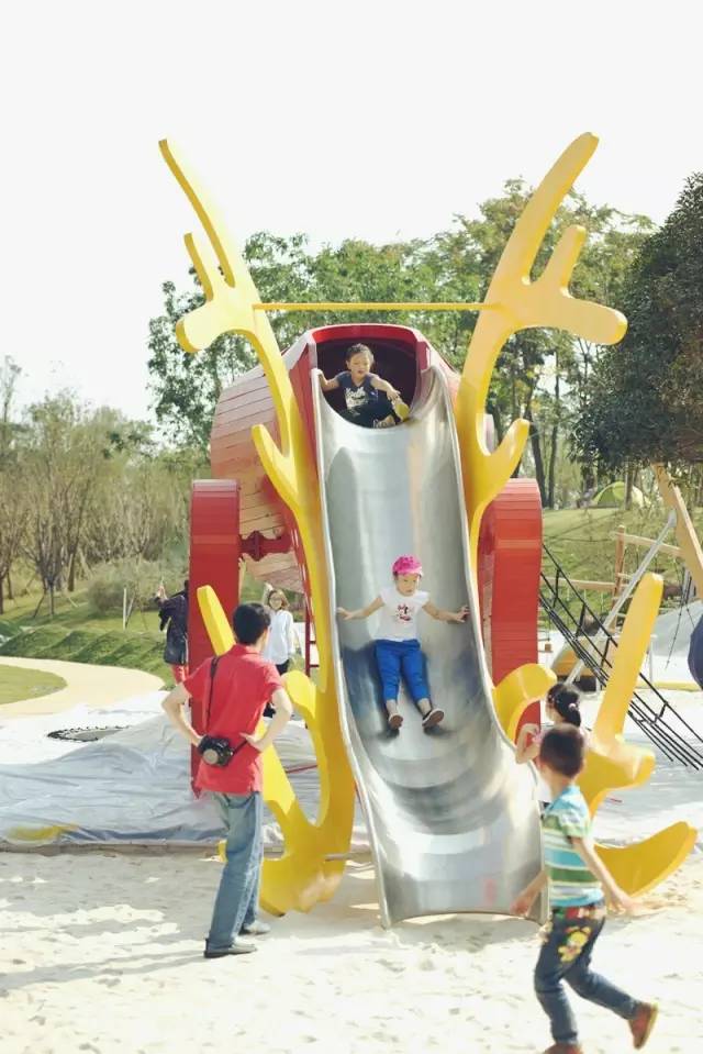 其中一條五彩的棧道是這片場地色彩的一大亮點,因為這是這片場地的主角“滑梯”的走道,五層樓高的彩虹滑梯就是一個非常有挑戰性的游戲,需要小朋友們展現出超出父母設想的勇氣,孩子們都有著愛冒險和探索的天性,危險和害怕是成長中有意的刺激,小朋友們可以在游戲中去學會獨自克服面對恐懼,進而獨自完成挑戰。