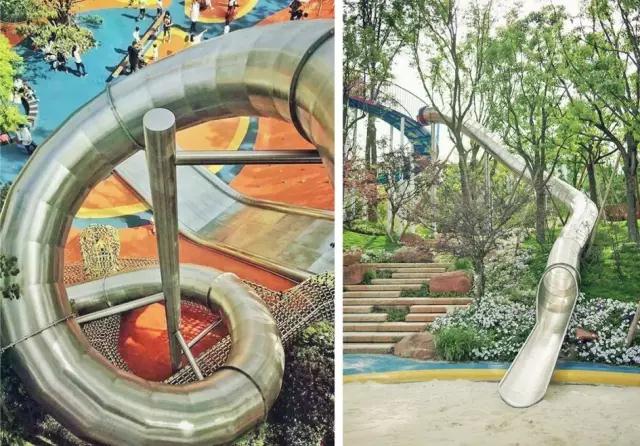 設計師甚至精心點綴了藍天白云在其間彩虹滑梯的兩條滑道,提供了兩種完全不同的滑行體驗。