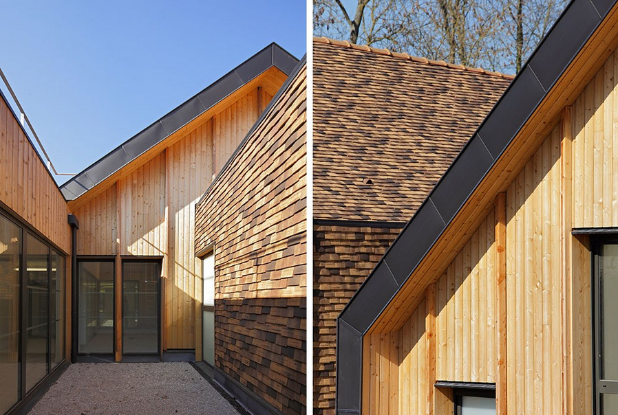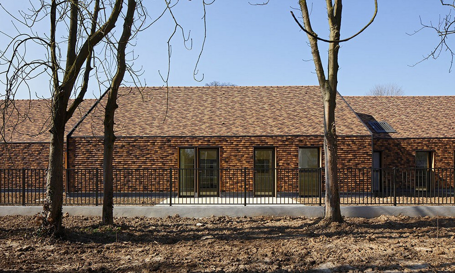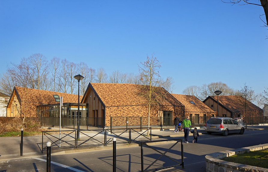 一座位于巴黎利耶于桑的幼兒園,設計師設計了大地色的陶瓷磚陶瓷磚的重疊像鵝卵石一樣覆蓋在獨特的坡屋頂建筑表面,裝點著幼兒園。覆蓋了整個幼兒園的屋頂和墻壁,遠遠看去就像是聚集在一起長滿鱗片的建筑群。