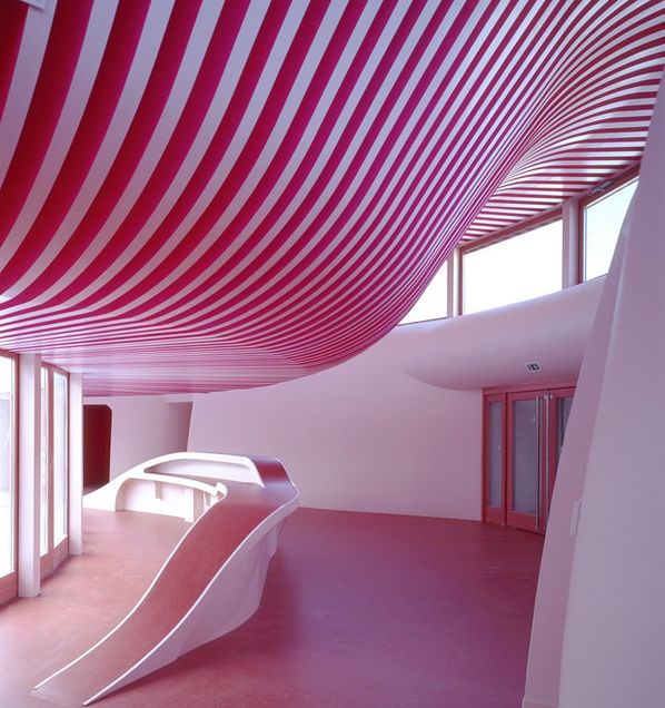 在這個建筑的屋頂和墻面甚至是家具的處理上都采用了波浪弧線的形式,因為這樣的設(shè)計可以讓讓室內(nèi)的空間充滿想象與童趣,同時也在許多屋頂設(shè)置了天窗,通過天窗可以讓自然的光線射入室內(nèi),幼兒園室內(nèi)設(shè)計采用的是粉色主題,在不同的角度的天窗照射進來的陽光也是多樣化,陽光和粉色裝飾相結(jié)合室內(nèi)也更加的溫馨明亮,自然采光的室內(nèi)不管是在哪個區(qū)域角度去看都充滿了新意和童趣。