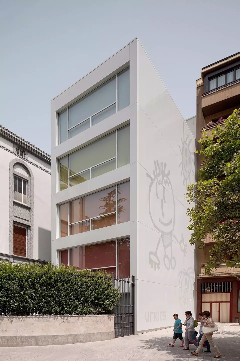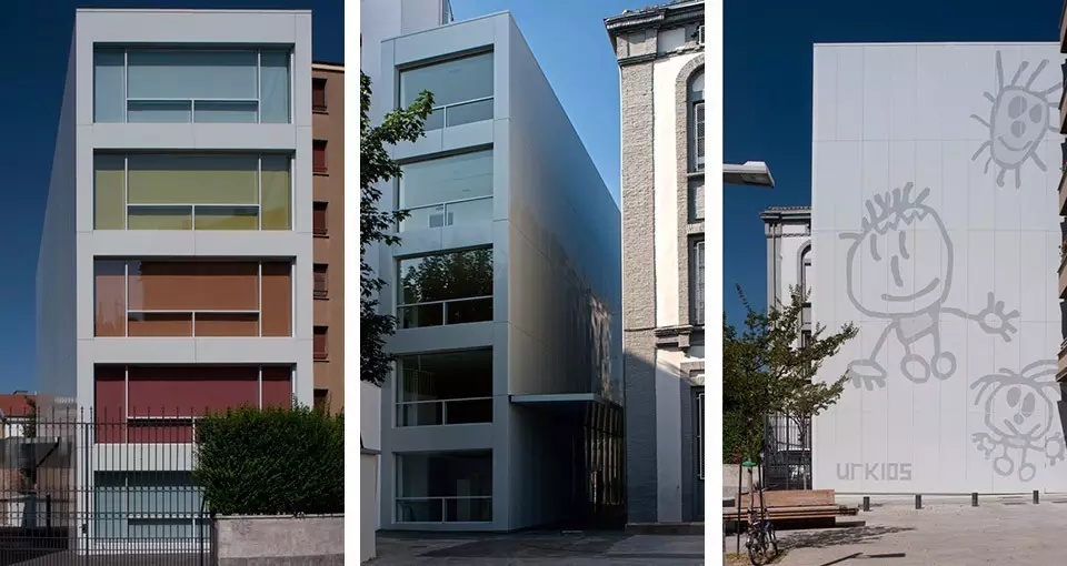 很多幼兒園都是占地面積廣闊,空間很大,但是有一所特別的幼兒園是特例,他就是UrKids幼兒學(xué)校,幼兒園是一棟白色五層高樓,就像是人們說的紙片樓,而設(shè)計師們則是把入口建在了建筑的長邊上。