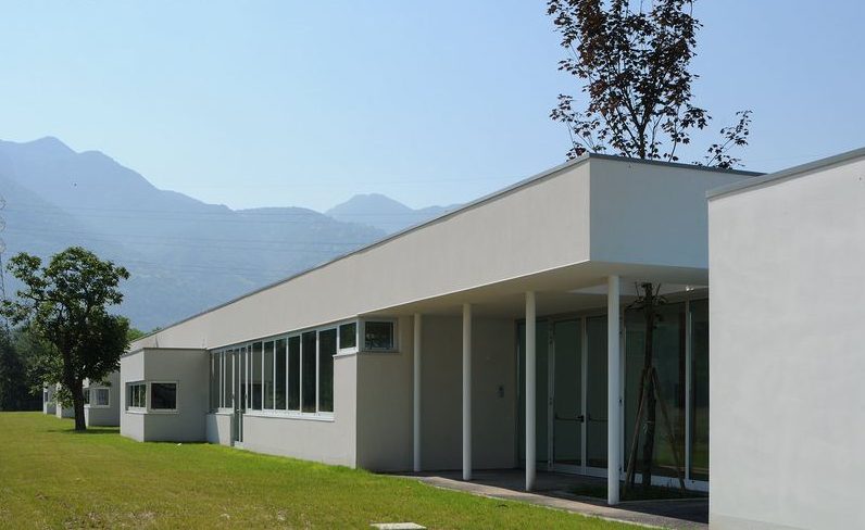 內(nèi)部的走廊看起來就像是電影里面的鏡頭。在入口后面,裝有玻璃的明亮處,有著一條隱蔽的走廊能通往不同的教室,它們的入口光線都是從高處照下來的。面對(duì)花園的走廊都裝上了玻璃窗,從這里往外看,可以看見精神運(yùn)動(dòng)性教室以及它外部的形狀、歷史中心的全景輪廓。