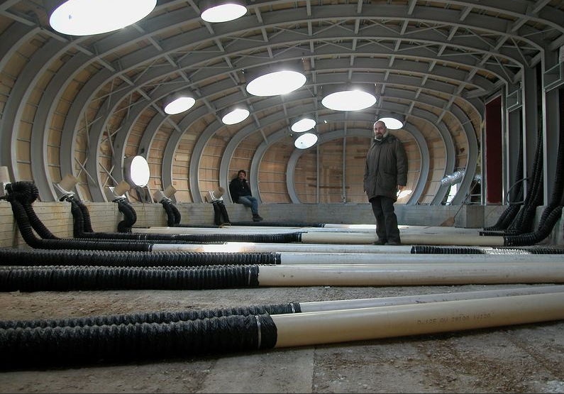 在另一邊,我們能看到有著其他特殊用途的房間:宿舍,美術(shù)室及活動(dòng)室。這是一個(gè)富有參與性的空間。在建筑內(nèi)部,你會(huì)感覺置身于一個(gè)地板結(jié)冰的洞穴里。而建筑外部的設(shè)計(jì)看起來就像是一個(gè)降落在花園里的宇宙飛船。光線從18個(gè)舷窗透進(jìn)來,這些舷窗分別安裝在墻壁和拱頂?shù)牟煌恢茫夜饩€的位置總是隨著時(shí)間和季節(jié)的變化而變化。