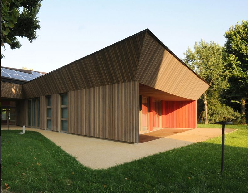 這棟建筑是由一系列連接著中心廣場的建筑群組成的,它的屋頂是不規則的幾何形狀,就像是皺紋紙一樣——這樣的形狀能更好地發揮光伏太陽能電池板的作用,這樣一來,在能源方面,這棟建筑幾乎是能夠自給自足了。建筑物的表層是由三種顏色的垂直條紋木板所組成,它們的尺寸是隨意組合的并一直延續到屋頂下的斜坡區域,形成了一種多變的紋理圖案,靜靜地被周圍的綠色所圍繞。檐廊及每片側翼的長廊仿佛是建筑群里的凹陷區域,并覆蓋了一層珊瑚紅顏色的垂直木板。這個設計好比是切片水果,里部的果肉是有色的,而外部的果皮是有紋理的。(幼兒園設計)