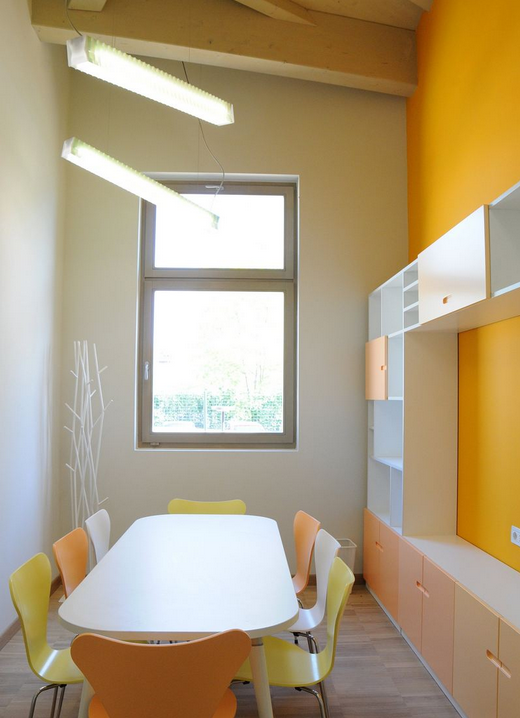 位于意大利的尼多卡利賓托兒所位于一個中型區域,通過一個中心廣場相互連通:這樣就能騰出很多空間給孩子們活動,而整個空間的比例是按照1-2歲的孩子們設計的。幾片側翼由一個單一的屋頂連接,而且都能通向中央大廳,走廊里還裝著空調。教室和“實驗室”向南分布,優先考慮自然采光和綠化帶;辦事處和服務區(洗衣房,更衣室,儲藏室)位于北面。