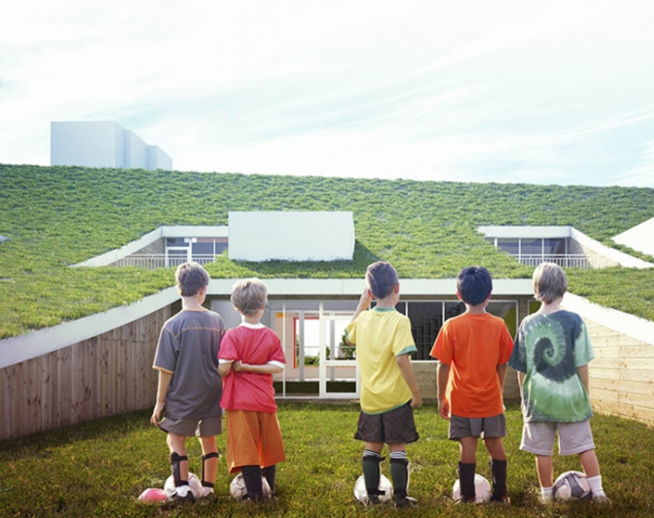 Rastvor的建筑師展現(xiàn)給我們的“山形幼兒園”,傾斜的綠色屋頂好似從地面掀開的一張綠紙,驚鴻一筆卻可以窺視這個(gè)因循守舊的規(guī)則街道所賦予城市的無聊紋理,而這些無聊的紋理周而復(fù)始組成了我們賴以生存的城市,從出生到死亡,每個(gè)人都屈從于規(guī)則之下,卑微而茍且。Rastvor的構(gòu)圖語言是如此鋒利,使屋頂和地面的界限變得模糊。在街道望向幼兒園,如同一段斷裂的地紋,既給孩子們創(chuàng)造了一個(gè)特別的活動(dòng)空間,更讓人聯(lián)想到孩子們與眾不同的想象力。(幼兒園設(shè)計(jì))