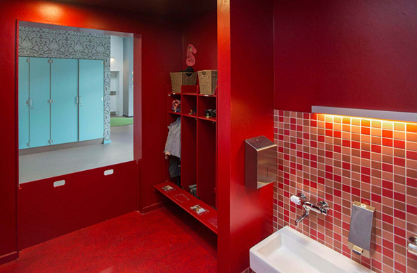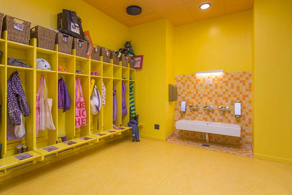 其幼兒園室內設計“宛如一個珠寶盒”:在整個幼兒園的內部都是繽紛的色彩、復雜的圖案和不同的肌理愉悅了孩子們的身心。同時裝飾有色彩、圖案豐富的壁紙和瓷磚。建筑如同一個大型的珠寶盒,這能夠喚醒孩子的好奇心,培養孩子們的探索精神,而且還為孩子們創造出五彩的內部空間和趣味十足的游樂場供孩子們玩耍嬉戲,有趣的活動空間設計讓孩子們的由著足夠是運動量。雖然平面布置十分復雜好似迷宮,但不同的色彩便于人們辨別方向。