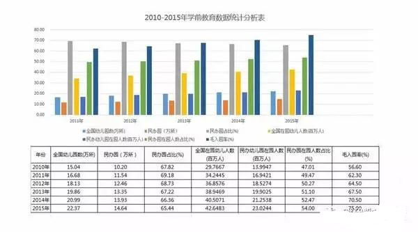 從數據得出,民辦幼兒園數量平均每年增長0.86萬所,2015年較2014年增長0.71萬所,假設“0.71萬所”的增速持續,2020年中國民辦幼兒園有望達到18.19萬所。民辦幼兒園在園人數占比達54%,并且該比例持續以每年1到2個百分點的速度增長。