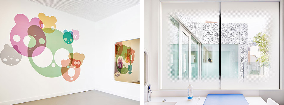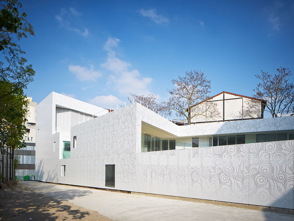 法國建筑事務所Avenier Cornejo設計的巴黎20區(qū)幼兒園建成,這所可容納66個孩子的幼兒園是一座獨特的建筑,為兒童提供安心的環(huán)境。建筑以混凝土為結構,滿滿占據(jù)著三角形地塊,并沿兩側邊緣開了三個內庭院,為建筑提供充足的陽光與光線。建筑周身覆蓋有著美麗花樣的金屬穿孔板。這層金屬外表皮還覆蓋了部分窗戶,為其提供過濾的光,并在夜晚像燈籠一樣透光。傍晚來臨的時候,兩旁的路燈亮出詳和的燈光,好像都在刻意討好這所幼兒園。它就像一位非常漂亮文雅的姑娘,周圍建筑和路燈都是敗在它的石榴裙下的紳士! 此幼兒園的顏色和圖紋,與周圍建筑想必是那么與眾不同,一下子就能夠把人們的目光吸引住了。