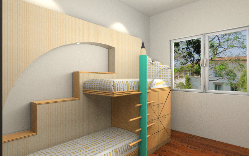 兒童臥室設(shè)計(jì)一:房間過(guò)小,但要配置齊全的功能。采用日式拉門衣柜,選用環(huán)保材料,確保兒童健康。在房間另一角落安排立體書(shū)柜,下面是可調(diào)整高度的書(shū)桌,連接書(shū)桌的是簡(jiǎn)單書(shū)柜,下面可以擺放一些小孩喜歡的玩具或者閱讀的書(shū)籍,方便取用,書(shū)桌上再安放一個(gè)環(huán)保臺(tái)燈,給小孩營(yíng)造一個(gè)私人空間。