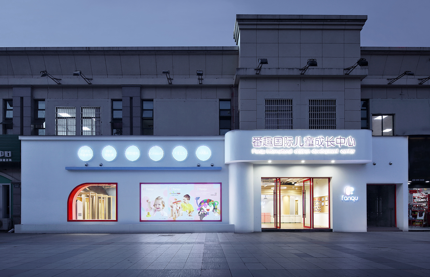 設計師延伸“番趣”的品牌形象,打造項目主入口外觀,品牌元素與園區的展示需求相融合,構成明凈活潑的外觀形象。門頭和前臺造型取自品牌“F”元素,以親切的姿勢歡迎小朋友和家長的到來。
