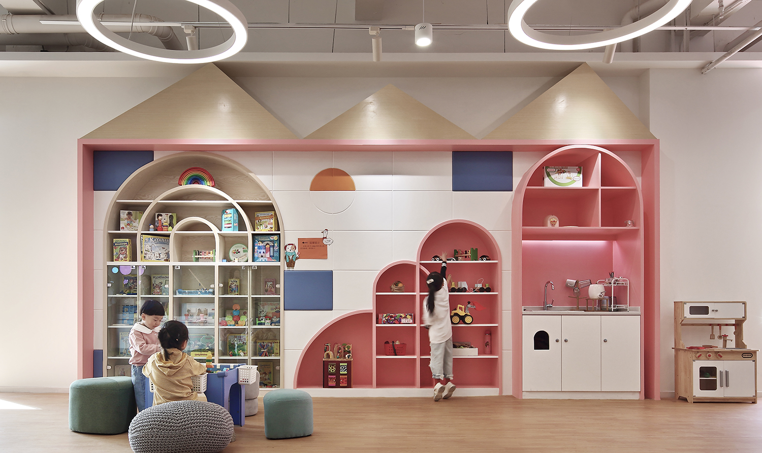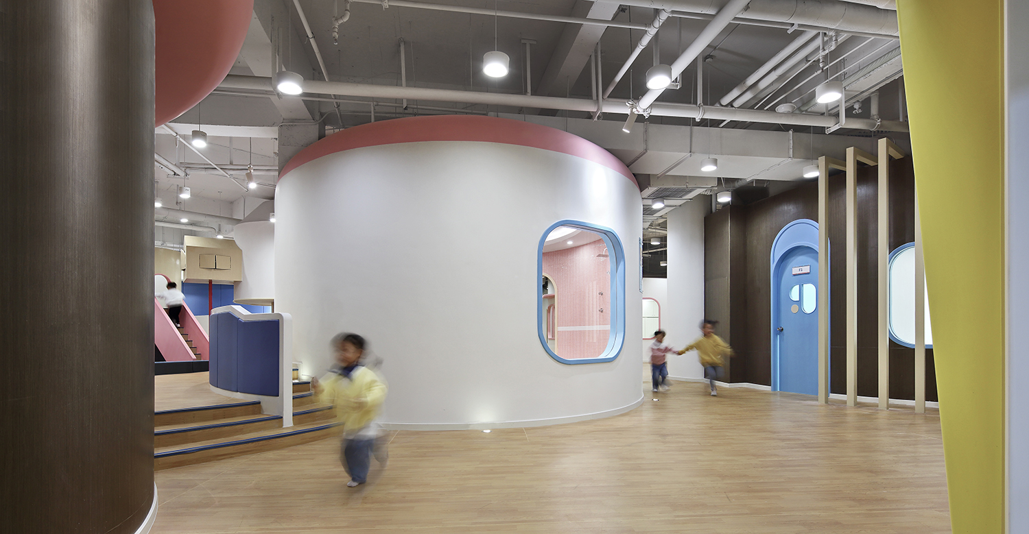 設計師將這些單個場所及其代表性元素,一一落實到番趣兒童成長中心后,不僅形成了有趣的分區和大量多元化的小角落,還驚喜地產生了很多趣味性的視覺呈現。室內的承重柱也不知不覺被設計師巧妙隱藏了起來。