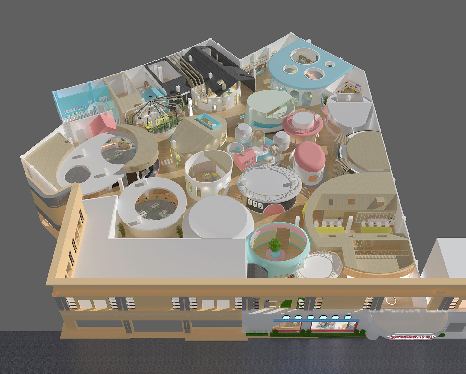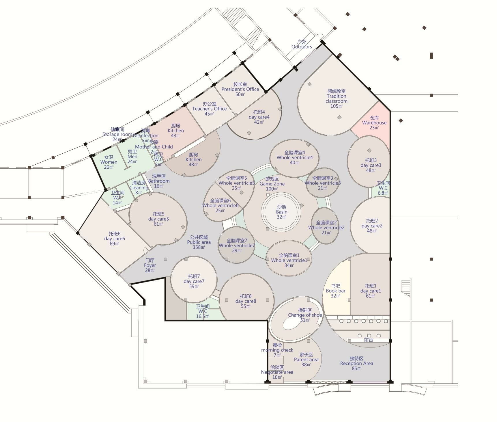 此次設計涉及早教和托育兩大版塊功能需求,包括16間教室、1個游樂區,以及書吧、辦公區、廚餐區等。設計師將原有場地進行清理和重新分割,根據項目需求和場地情況將中部規劃為早教區,托育教室則圍繞早教區環形安置,主門在南面,接送門在西側。