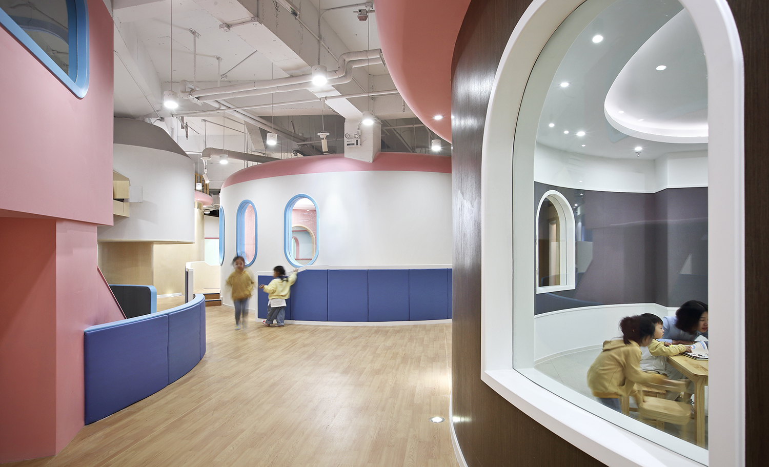 設計師將室內采光最充足的區域留給餐廳、繪本區等公共區域,同時打造開放感,以此盡量延展陽光在成長中心的照射范圍。當陽光進來,仿佛天燈將整座城市點亮。孩子們能夠在陽光下活動,吃飯、讀書、玩樂,隨著時間的變化觀察光影,感受陰晴雨雪和四季變化。