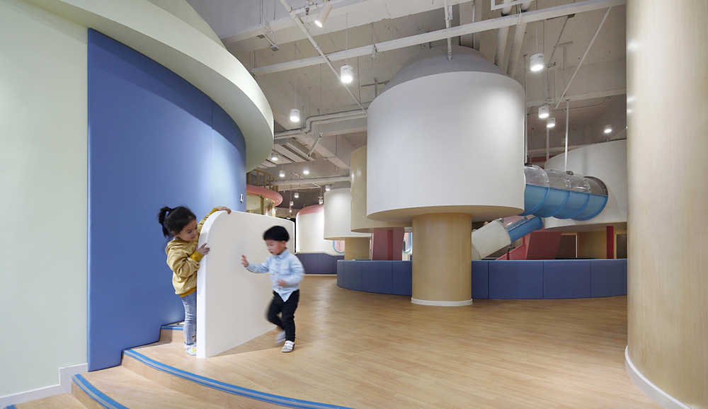 游戲是孩子的活力之源,也是孩子通往世界的途徑。設計師將游樂區布局在室內的中心位置,讓孩子的歡聲笑語激活整座“城”。孩子們會帶著好奇和期待爬上梯子,穿過可愛的小木屋,在管道中匍匐前進,然后“咻”地一下滑入下沉的球池,在不斷變化動作和愉悅的體驗中獲得身心的鍛煉和能力的發展。