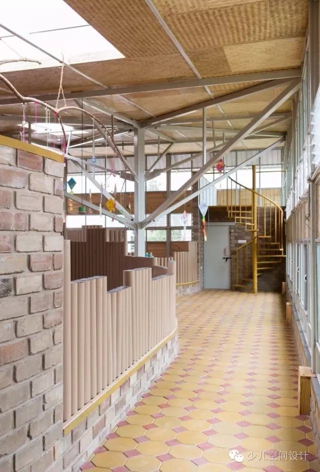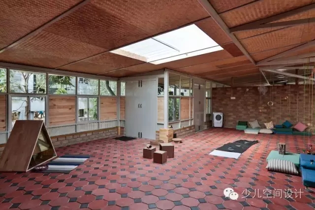 建筑包含4間教室,中心廣場(chǎng)邊上的一間工作室和一間幼兒?jiǎn)⒚芍行牡姆块g與廣場(chǎng)之間有著過(guò)度的濾光板。衛(wèi)生間的設(shè)計(jì)考慮到了低領(lǐng)人群,小型的尺度不僅適合孩子,還方便監(jiān)護(hù)。衛(wèi)生間暴露的排水管與小便墻的設(shè)置能夠被孩子舒適地使用,并易于維護(hù)。