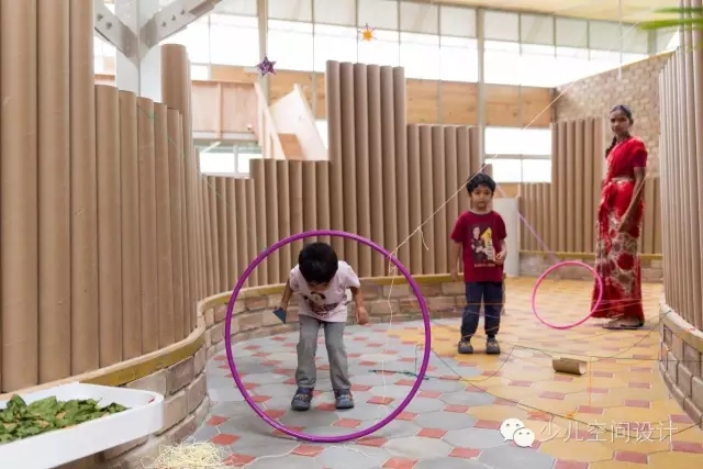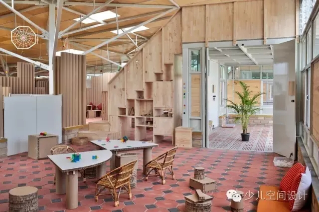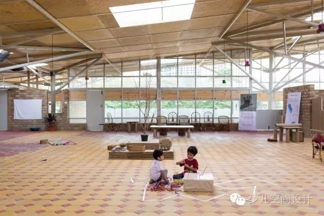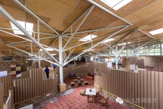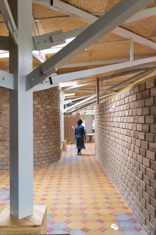 通過(guò)滲透性的室內(nèi)設(shè)計(jì),鼓勵(lì)了孩子們的探索學(xué)習(xí)——不同高度的墻體圍合了懸挑的教室和公共空間,其上是穿孔的天窗。屋頂收到8根柱子的支撐,每一個(gè)形式都是樹(shù)枝分叉。這個(gè)樹(shù)的形式,在形成結(jié)構(gòu)元素的同時(shí),讓屋頂?shù)母叨饶軌蚋鼮楹⒆觽兯兄!皹?shù)”下的空間同時(shí)重新詮釋了學(xué)習(xí)的區(qū)域,這樣的場(chǎng)景在郊外隨處可見(jiàn)。