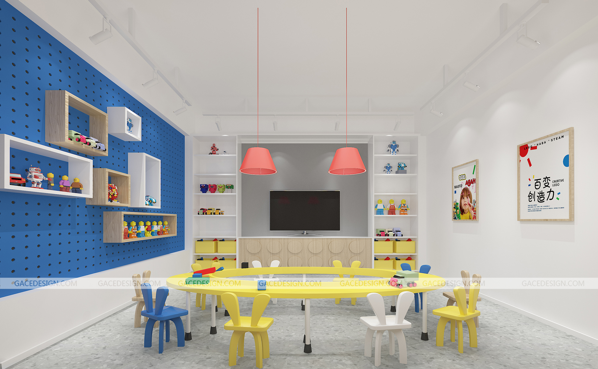 在早教中心裝修時,在講堂內的家具選擇上,要選沒有棱角的桌椅。材質最好用原木的,人造板材中含有甲醛,對人的身段有害。另在裝修的時候,最好用環保無毒的水性漆,墻面用人造壁紙,地磚要耐用。